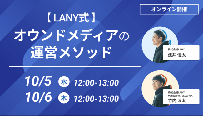 SEOコンサルティングを提供する株式会社LANY(東京都渋谷区、代表取締役社長:竹内渓太)は、【LANY式】オウンドメディアの運営メソッドを解説するウェビナーを10月5日(水)、10月6日(木)の2日間で開催いたします。