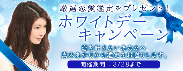 『ホワイトデーキャンペーン』では恋心が揺れ動くこの季節に相応しい、恋愛鑑定をご用意いたしました。また本キャンペーンでは、対象の鑑定をご購入の方に「厳選恋愛鑑定」をプレゼントいたします!この機会にぜひ「真木あかりの占い」をご利用ください。