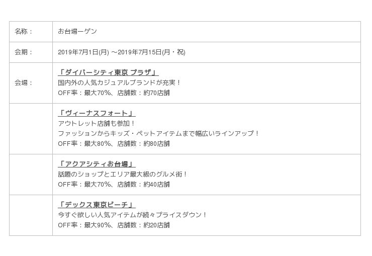 最大90%OFF!! キャッシュレスがお得な夏の合同バーゲン「お台場ーゲン」 7月1日(月)〜7月15日(月・祝)同時開催!