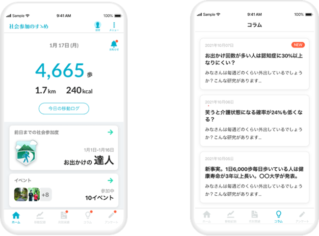 本事業のプラットフォームとして中核となるのは、2022年春にリリースする、スマートフォンアプリ「社会参加のすゝめ」です。スマートフォンの位置情報や歩数などのデータを用いて、疑似的に社会参加状態を計測できるほか、アプリ内に設けたコラム機能から配信される、JAGES機構の優れた先行研究の論文を一般のシニアにも分かりやすい内容に要約したコラムを読むことができるなど、アプリ利用者は介護予防のための理想的な健康状態に近づくために何をすべきかを知ることができ、シニアの介護予防に向けた知識獲得と社会参加を促進します。