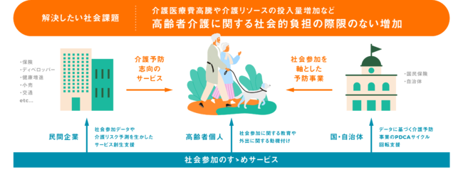 たとえば、保険会社とは、社会参加の状態が活発で介護リスクが低いと認められる場合に、保険料の割引や、他サービスの特典を付与するなど、金融に限らないさまざまなサービスの利用において優遇が得られる仕組みの開発が期待できます。そのほか、交通事業者や小売事業者などと連携し、シニアの積極的な「おでかけ」を推奨するイベントの開催や、自治体の介護予防施策の効果を社会参加の側面から定量的に測定するなど、さまざまな業界とのコラボレーションを図っていきます。