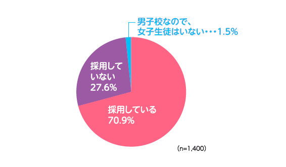 今回、全国の中学・高校の教員1,400人を対象に自身の勤務する学校において、女子生徒のスラックス制服の採用状況を調べたところ、「採用している」(70.9%)という結果で、約7割の学校で女子生徒にスラックス制服を採用していると回答していました。