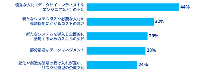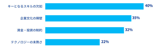 デジタル技術の導入において企業が直面している最大の課題は、優秀な人材の不足です。ほぼすべての業務にデジタルツールが利用されるようになった今、ビジネス領域の知識とデジタルスキルを併せ持つ優秀な人材がますます必要とされるなか、企業は能力開発の機会や報酬制度を設け、ソフトウェアエンジニアやデータサイエンティストなどスキルを持った技術者にアピールする必要があります。