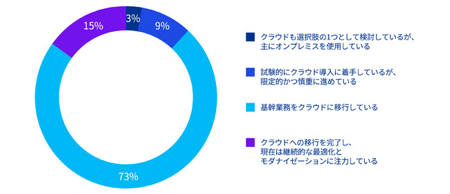 今回の調査から、クラウドへの移行が順調に進んでいることが明らかになりました。クラウドの導入に進展がみられたという回答は88%(10社に9社)に上っています。また、73%は基幹業務をクラウドに移行しつつあり、さらに15%はすでに移行を完了させ、その先のシステム最適化の検討をはじめています。