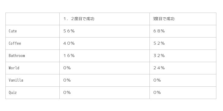 ヒントがあってもあまり成功率が上がらなかったというのが前回と比べての感想です。