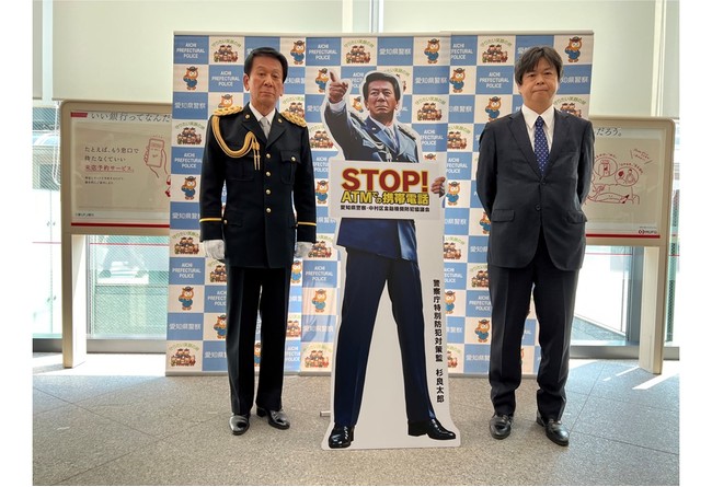 また杉対策監は、三菱UFJ銀行名古屋駅前支店で開催された、「STOP!ATMでの携帯電話」運動による還付金詐欺被害防止の啓発イベントに参加。還付金詐欺の被害防止のためにATMでの携帯電話の通話自粛を呼びかけるべく制作された、自身の等身大パネルのお披露目の場に立ち会いました。その後、杉対策監は銀行に来た県民に向け啓発チラシを配布。自身のパネルとともに、特殊詐欺防止の呼びかけを行いました。