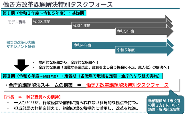 そのなかで、増え続ける業務量と困難な事業廃止、職場の課題について意見を出し合う機会の不足、業務の属人化と特定の職員への偏りといった全庁的な課題に着目し、これらの解決を目指して本タスクフォースの立ち上げが決定、市役所内の幹部職員が担当業務の枠を超え、横断的な改革をスピード感をもって進めていくべく、創業以来15年以上働き方改革に携わる当社が支援を行います。