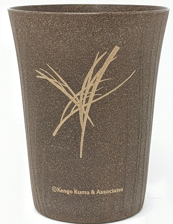 タンブラーの正面には建築家・隈研吾氏が設計したサイクリングセンターの装飾に使用されている茅のデザインモチーフを刻印しています。隈研吾氏は2021年7月に真庭市に開業した観光文化発信拠点施設「GREENable HIRUZEN(グリーナブルヒルゼン)」を設計しています。施設内にある「サイクリングセンター」は茅を軒下や天井に活用しており、資源を生かし循環させる新時代の建築を体現する建物として注目されています。