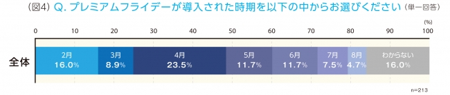既にプレミアムフライデーを取り入れている企業にお勤めの方に対して、導入した時期を聞いたところ、スタートした2月ではなく4月より導入されたという回答が最も高い結果に。 (図4)