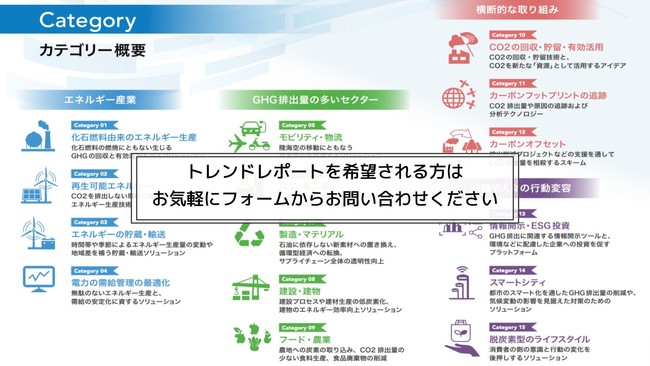 再生可能エネルギー、モビリティ・物流、カーボンオフセット、脱炭素型のライフスタイルなどのテックトレンドを一括把握