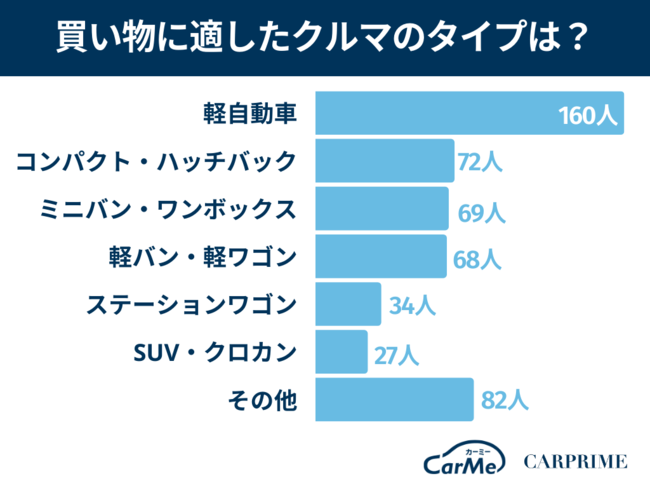 買い物に適したクルマのボディタイプでは、軽自動車が160名(53.3%)で約半数を占める結果となりました。次点でコンパクト・ハッチバック(72名/24%)、ミニバン・ワンボックス(69名/23%)、軽バン・軽ワゴン(98名/22.7%)と続いています。