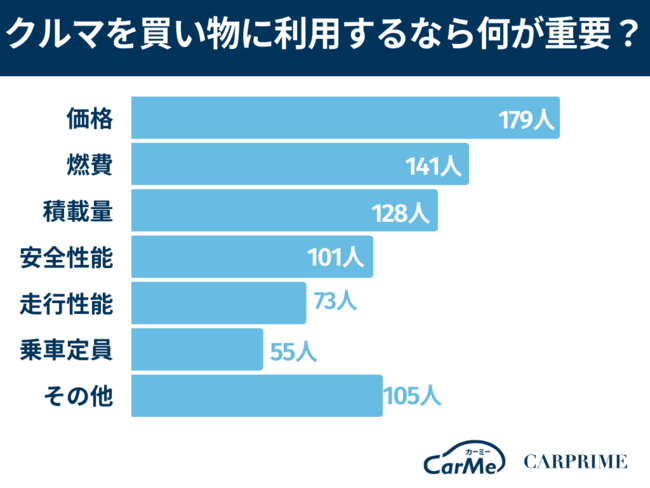 クルマを買い物に利用する場合、重要になるポイントは、価格が179名(59.7%)で最多となりました。2番目の燃費が141名(47%)、3番目の積載量が128名(42.7%)となっています。