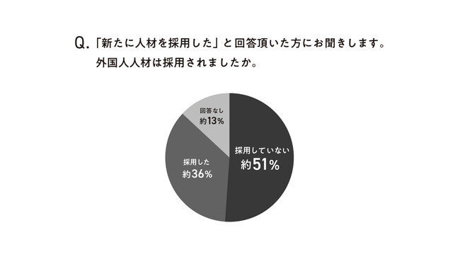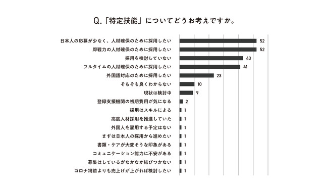 このような中、外国人人材の採用に関しては、半数以上が採用していないと、外国人人材の雇用が進んでいない現状も。例えば、働き手不足の解消を目的として設立された在留資格「特定技能制度」については、9割以上が理解していると回答しているにも関わらず、設立から3年経過した今でも、現場での活用が積極的に進んでいない可能性があることが見て取れた。