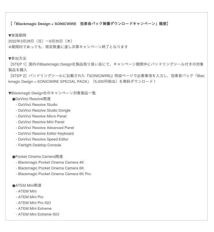 なお、バンドリングシール付きの対象製品は数量限定のため、期間中でも限定数量に達し次第、本キャンペーンは終了となります。本キャンペーンの対象製品は国内のBlackmagic Design社製品取り扱い店で購入可能ですので、どうぞお早目にご確認ください。