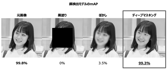 当社が保持する人物画像に対して、従来のマスキング(黒塗り処理及びぼかし処理)と「ディープマスキング」をそれぞれ実行し、作成されたデータセットをベースに顔検出モデルを構築。人物検出の精度を評価した結果、「ディープマスキング」で作成したデータセットで学習した顔検出モデルは、元画像とほぼ変わらない精度で顔検出できることを、既に検証しています。