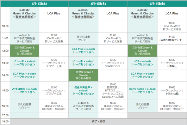 当社ブースでは、「e-dash」サービスの紹介に加えて、事例紹介や、先日リリース発表した新機能「省エネ法定期報告 via e-dash」についてのデモンストレーションなどを予定しています。また、3日間に亘って提携パートナー様各社と共同トークセッションを実施します。