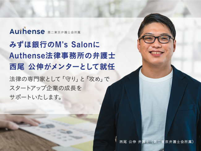 Authense法律事務所(東京都 港区)は、みずほ銀行の会員サービスM's Salonのメンターに、当事務所の弁護士 西尾 公伸が就任いたしましたことをお知らせいたします。企業の経営者や起業家の方々が就任され、活動されている中、今回初めて弁護士がアドバイザーとして就任することになりました。法律の専門家として、企業の実情に寄り添い、「守り」と「攻め」でスタートアップ企業の成長をサポートいたします。
