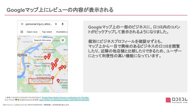お客様の声のDXサービス「口コミコム」を運営する株式会社mov(代表取締役:渡邊 誠、本社:東京都渋谷区、以下mov)は、Googleマップ・Googleビジネスプロフィール(Googleマイビジネス)の更新情報や、口コミマーケティングノウハウなどの最新ニュースをまとめた「MEO・口コミマーケまとめ【2022年5月版】」を公開しました。