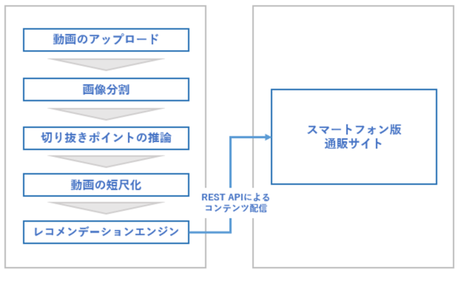 画像認識の技術を応用して商品閲覧数の増加が期待できる箇所を自動で短尺動画化するサービスを開発しました。当該サービスはAWSが提供するクラウド環境内で構築し、短尺化の対象となる動画がクラウド環境にアップロードされることをトリガーとして動画の各カテゴリに応じたモデルで推論を行い、推論結果の値を利用して動画の切り抜きポイントを特定してシーンを抽出することで、短尺動画として保存されます。また、作成された短尺動画は、通販サイトのユーザーの閲覧動画に基づき、レコメンデーションされることで、商品閲覧数が増加し、通販サイト経由での売上増加に寄与することが期待されています。