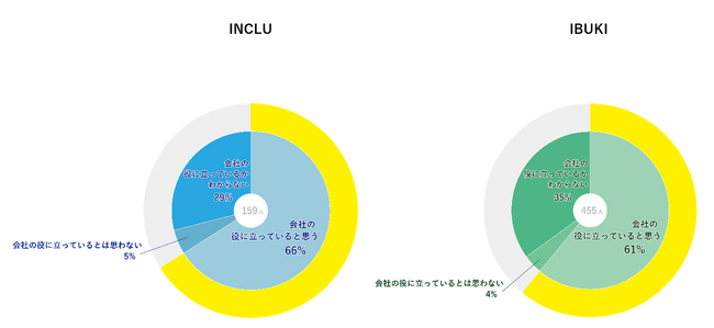 「あなたの仕事が会社にどのように役立っているかと思うか」という質問に対して、「役立っていると思う」と答えた方は、INCLU 66%、IBUKI 61%という結果が得られました。一方で「役に立っているかわからない」と答えた方が、INCLU 29%、IBUKI 35%いらっしゃいました。自由記述のコメントによると、同じ仕事をしていたとしても、仕事に対するフィードバックの有無によって、会社の役に立っていると思うかどうか意見が分かれていることがわかりました。