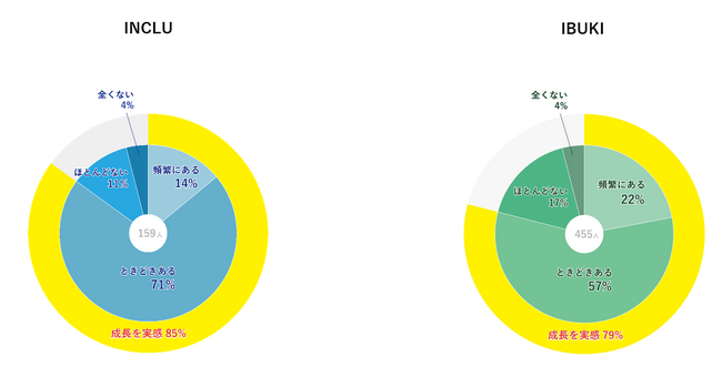 「仕事を通じて自分自身が成長している実感はありますか」という質問に対して、「頻繁にある」もしくは「ときどきある」と答えた方の合計は、INCLU 85%、IBUKI 79%という結果になりました。単に仕事ができるようになったことを成長と捉えるのではなく、コミュニケーション能力が上がってきた、ストレスのコントロールができるようになってきたなど、障害に起因する自分自身の課題に対処できるようになっていると思われる回答が多く見受けられました。