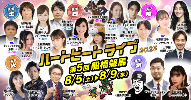 船橋ケイバでは、令和5年度第5回開催を8月5日(土)〜8月9日(水)に開催いたします。場内イベントのお知らせは次頁以降に詳細を記載しておりますのでご覧ください。滞留人数が3,000人を超えた時点で入場制限を行うことがありますので、あらかじめご了承ください。