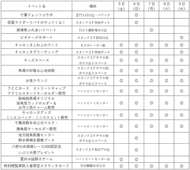 さらにプロバスケットボールチーム「千葉ジェッツ」とのコラボイベントが8月6日(日)に行われるなど、注目のイベントが盛りだくさん!8月も船橋ケイバにお越しいただき、楽しい夏のひと時をお過ごしください!