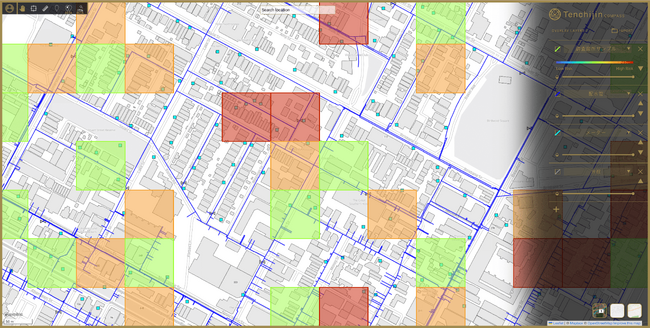 ※画像は「天地人コンパス 宇宙水道局」のサンプルとなります。色のついている場所は水道管の漏水リスクの恐れのある場所を指しています。漏水リスクの高低差を5段階に分けており、赤色は漏水リスクの最も高い場所を指しています。