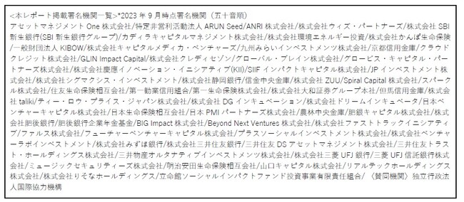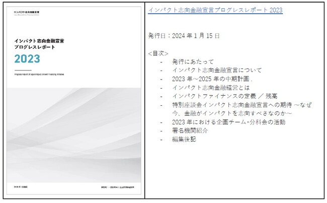 また、レポートでは、高倉透三井住友トラスト・ホールディングス株式会社取締役執行役社長、清水博日本生命保険相互会社代表取締役社長社長執行役員、田代桂子株式会社大和証券グループ本社取締役兼執行役副社長による特別座談会「インパクト志向金融宣言への期待〜 なぜ今、金融がインパクトを志向すべきなのか〜」の報告を掲載するほか、署名機関・賛同機関の個社のインパクト志向金融経営の取り組みを紹介しています。