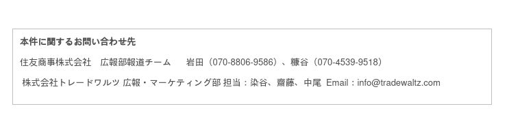 貿易情報連携プラットフォーム「TradeWaltz(R)」を運営する株式会社トレードワルツ(本社:東京都千代田区、代表取締役社長:小島 裕久、以下:トレードワルツ)と住友商事株式会社(本社:東京都千代田区、代表取締役 社長執行役員CEO:兵頭 誠之、以下:住友商事)は、住友商事によるトレードワルツへの出資参画に合意し、払込みが完了しました。トレードワルツは、住友商事からの新規出資に加え、既存株主からの追加出資も受け、これにより16.5億円の追加資金を調達し、資金調達累計56.5億円を達成します。
