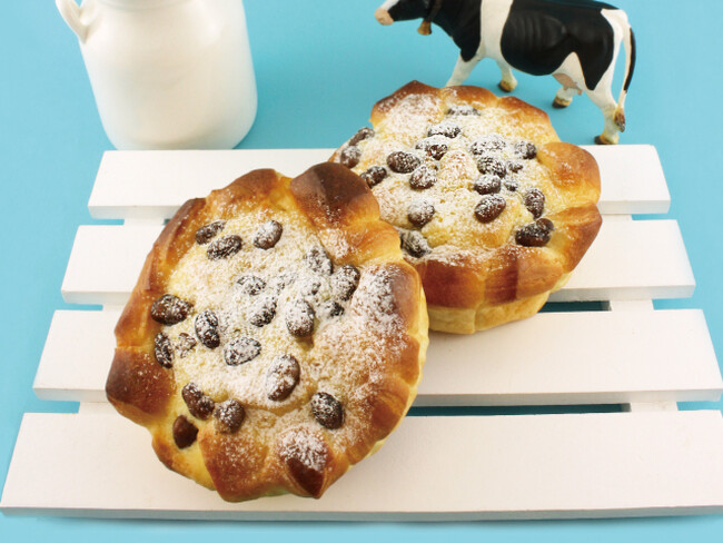 北海道産牛乳を使用したミルククリームを折り込んだ生地に、クッキー生地と大納言かのこをトッピングして焼き上げました。