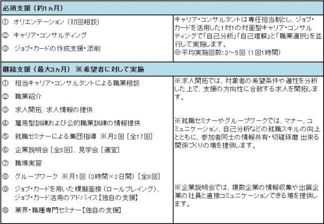具体的には、ジョブ・カードを活用したキャリア・コンサルティングを通じて、支援対象者自身が自己理解を深め、自らの職業意識やキャリア形成上の課題を明確にし、今後の職業選択やキャリア形成の方向付けが可能となるよう支援します。また、就職セミナーやグループワークなども実施し、支援対象者同士が意見交換や情報交換をすることで、就職意欲を高め、自律意識の醸成を図るとともに、ハローワークとの連携により、就職に関する相談から具体的な求人の紹介まで切れ目のない支援を行います。