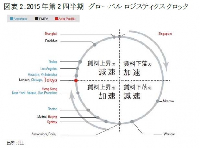 東京圏の月額賃料※2は前期比1.3%増の4,185円、東京ベイエリア※3は前期比0.9%増の4,526円、東京内陸エリア※4は前期比2.0%増の3,932円となりました。「グローバル ロジスティクス クロック」をみると、東京圏の賃料上昇率はピークを迎えています。