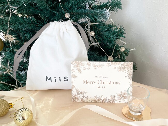 外出先への持ち運びにも便利な、MiiSのロゴを施したシンプルデザインの巾着、ギフト用のメッセージカードとしてもお使いいただけるオリジナルデザインのクリスマスカード、ブレスエッセンス専用のグラスなど、ここでしか手に入らないアイテムをご用意しました。