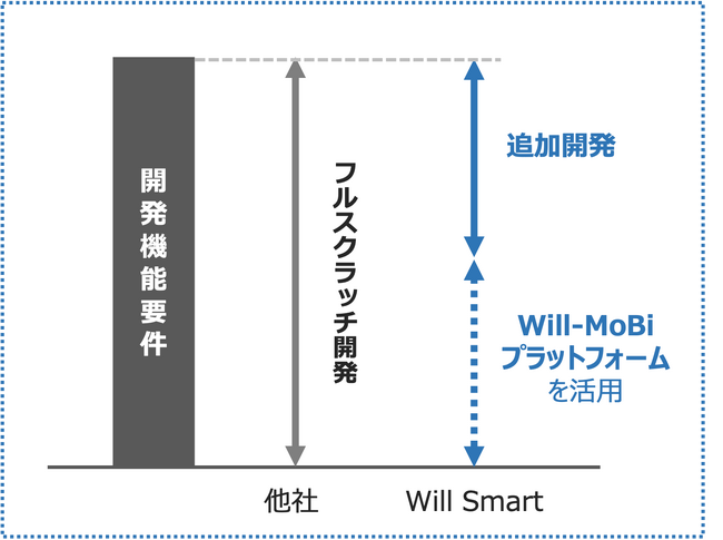 今回発表する『Will-MoBi』は、DXプラットフォームとして、本システムが有する各種機能を組み合わせ、もしくは一部をカスタマイズすることでさまざまなサービスの開発を効率的に実現。一般的にフルスクラッチで構築するような大規模なシステム開発を不要としています。フルスクラッチでの開発に比べて、短い納期・低いコストでも安定した品質での開発が見込め、予算や納期に制限を持つ自治体や企業でも導入しやすいサービスとなっています。