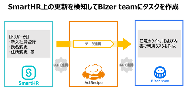 ActRecipeは、SaaS同士を連携することで業務を自動化するサービス(iPaaS: integration Platform as a Service)として、主に大企業にご採用いただいております。ActRecipeでは特にバックオフィスの業務の自動化を得意としていることもあり、企業規模を問わずバックオフィスの業務効率化をご支援されていたBizer teamとの連携を検討しておりました。この度、ActRecipeが既に連携しているバックオフィス関連SaaSの中でも特にBizer teamとの親和性の高いクラウド人事労務ソフト「SmartHR」(株式会社SmartHR提供)との連携を行うことといたしました。Bizer teamとSmartHRを連携することによって、SmartHR上に新たに登録された新入社員情報や既存従業員の各種情報の更新内容がタイムリーにBizer teamに連携され、スムーズな情報連携とタスク管理を実現できるようになりました。