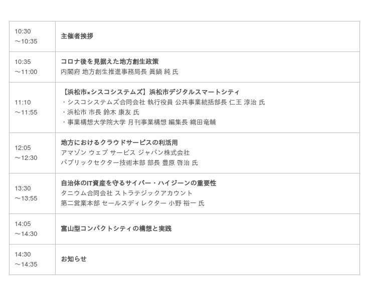 ポストコロナを見据えて「新しい生活様式」への対応が地域に求められています。前例踏襲主義から脱却し、行政のデジタルシフトや持続的な地域の発展を進めるため、本フォーラムでは最新の公民連携のあり方やデジタル活用の好事例の紹介、自治体と企業の対談を通じた地域課題の掘り起こしなどを行い、明日から使える地方創生のアイデアを提供します。