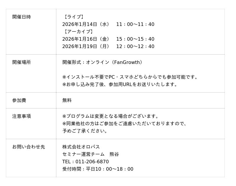 SEOツール「パスカル」の開発・提供を行う株式会社オロパスは、2026年1月14日(水)に、WEBマーケティング会社さま向けに新たなマーケ支援サービスを提案するウェビナーを開催いたします。