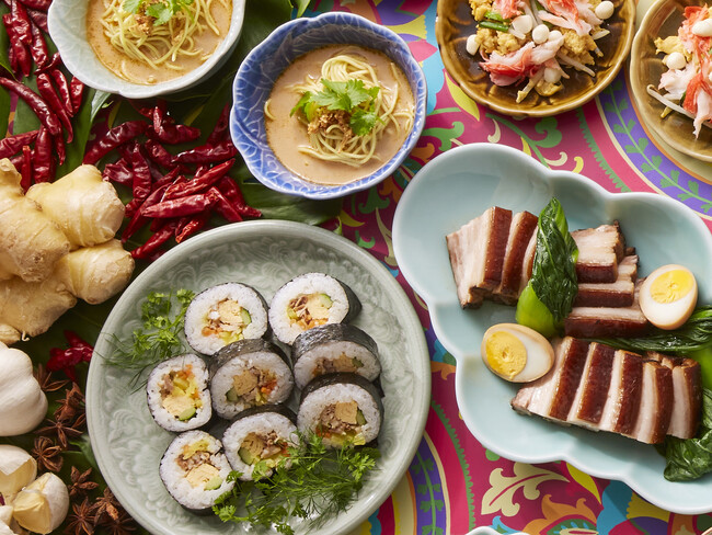 ■冷製料理:蒸し鶏と野菜の生春巻き、ローストビーフのサンドイッチ ベトナム風、キンパ、鰻の冷製茶碗蒸し、ビンチョウマグロのたたき、海老と焼き茄子とトマトの出汁ひたし、にぎり寿司(5種)など