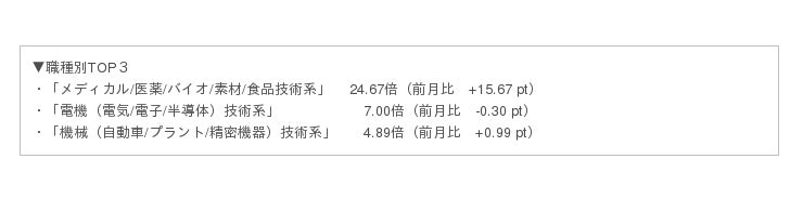 グローバル転職求人倍率を職種別に見ると、TOP3は「メディカル/医薬/バイオ/素材/食品技術系」、「電機(電気/電子/半導体)技術系」、「機械(自動車/プラント/精密機器)技術系」となりました。