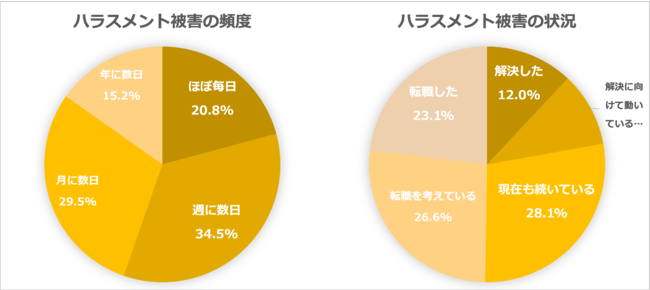 ハラスメントの頻度については「ほぼ毎日」20.8%と「週に数日」34.5%を合算した55.3%が週に数日以上被害を受けている回答結果になり、「月に数日」は29.5%、「年に数日」は15.2%でした。