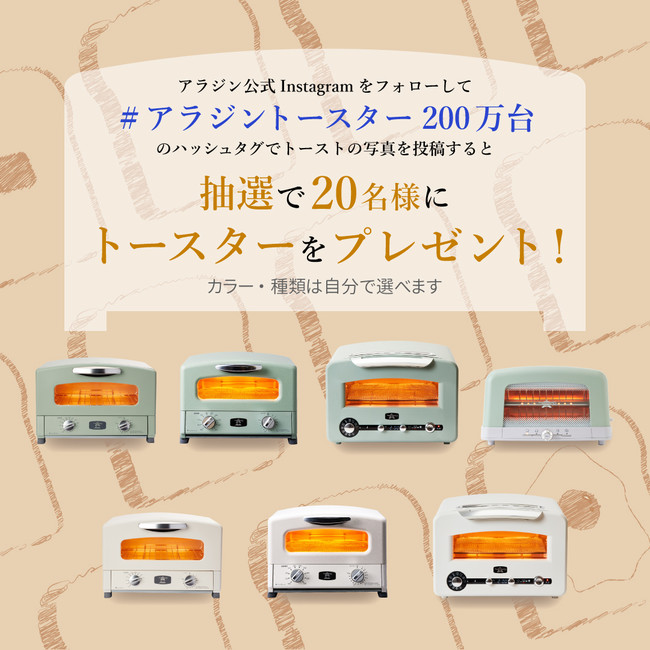 これを記念して、今まで支えていただいたお客様へ感謝の気持ちを込めて、スペシャルキャンペーンを開催する運びとなりました。本キャンペーンは、アラジン公式Instagramをフォローの上、指定ハッシュタグ「#アラジントースター200万台」とともにトーストの写真を投稿いただいた方の中から、抽選で20名様にお好きなアラジントースターをプレゼントいたします。