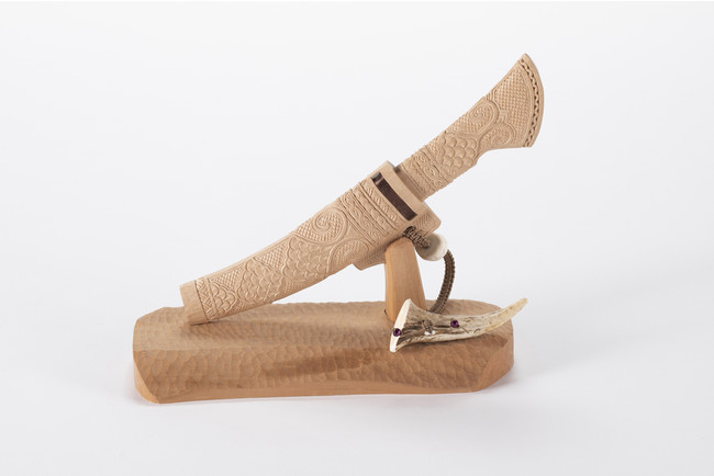 木製の柄と鞘に緻密な文様が刻まれ、山仕事や護身用など、日常のあらゆる場面に欠かせない重要な実用品。小型のマキリはメノコマキリという。