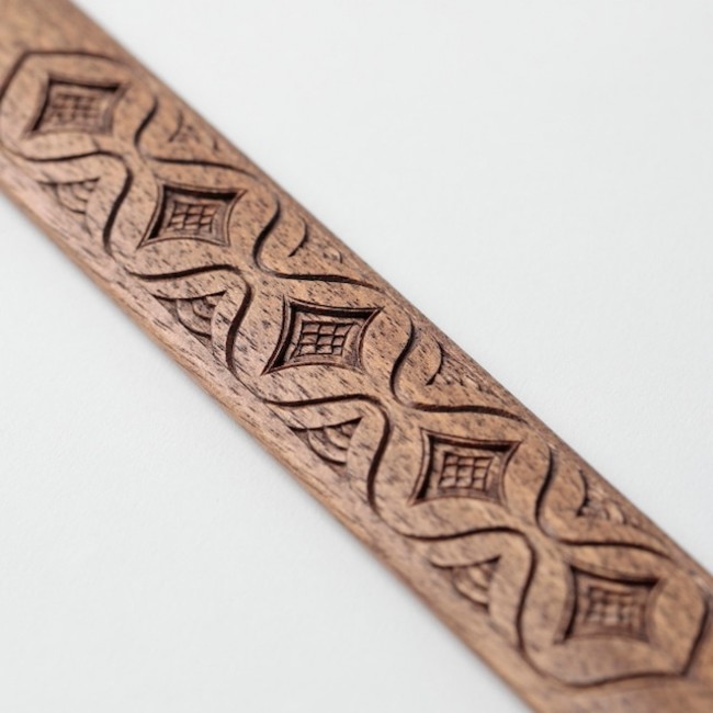 持ち手にアイヌ文様を木彫で施した、パスイのような靴べら