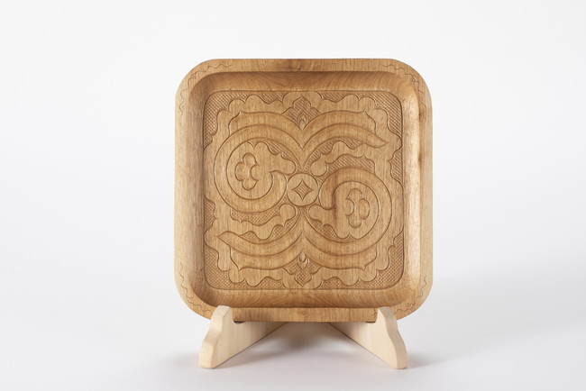 おもに平取町二風谷地区で伝統的技法で作られた木製の盆。平面にアイヌ文様が隙間なくラ?ラ?ノカ (ウロコ模様)は二風谷イタの特徴。