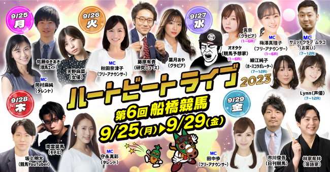 船橋ケイバでは、令和5年度第6回開催を9月25日(月)〜9月29日(金)に開催いたします。場内イベントのお知らせは次頁以降に詳細を記載しておりますのでご覧ください。滞留人数が3,000人を超えた時点で入場制限を行うことがございますので、あらかじめご了承ください。