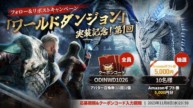 10月26日(木)の定期メンテナンス後より、「ワールドダンジョン」実装を記念したフォロー&リポストキャンペーン第1回を開催します!『オーディン:ヴァルハラ・ライジング』公式X(旧Twitter)をフォローした状態で、同日に投稿されるキャンペーンポストをリポストされた方の中から、抽選で10名様にAmazonギフト券5,000円分をプレゼント!