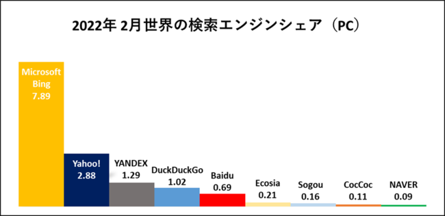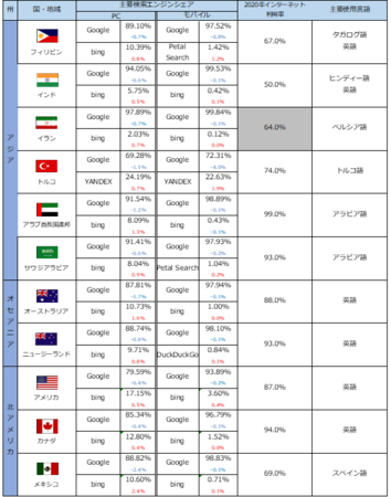 2022年2月 各国・地域におけるPCとモバイルの主要検索エンジンシェア