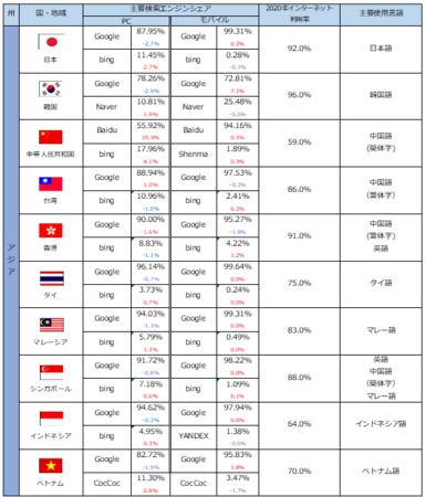 ※用語の定義として、検索エンジンとは検索システムを提供する会社、ブランドを指します。具体例を挙げると、日本で最も人気のあるポータルサイトの一つ「Yahoo! JAPAN」は、検索エンジンとしては「Google」という扱いとなり、同様の理由から「Yahoo!台湾」や「Yahoo!香港」はMicrosoft Bingとなります。