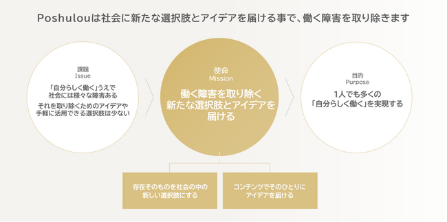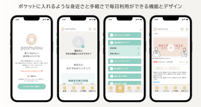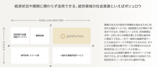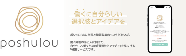 ポシュロウは働くことに障害がある方が、就労にあたり新たな選択肢とアイデアを得るために必要なメニューを備えた「学習と情報収集のちょうどあいだ」を目指したWebサービスです。